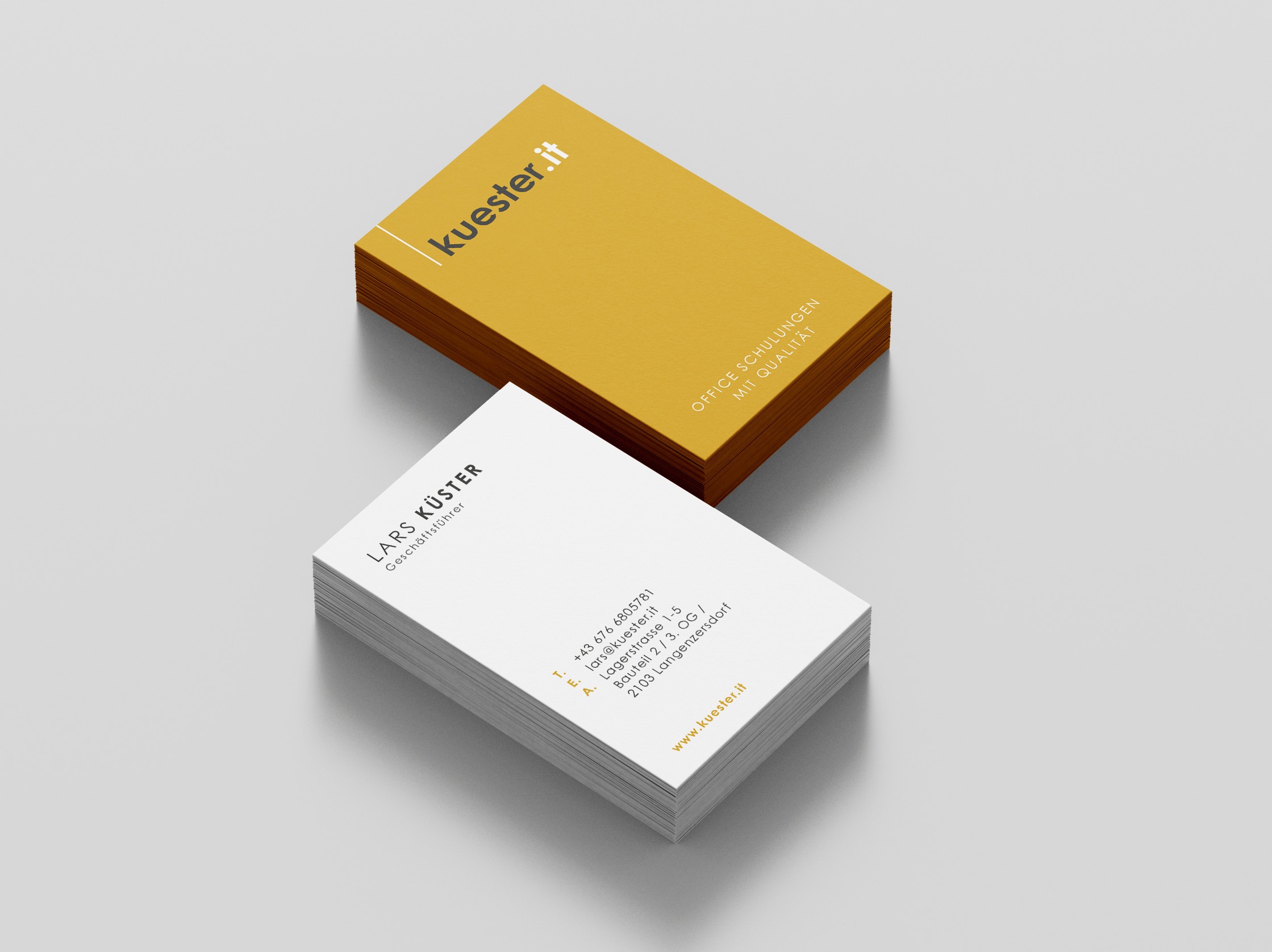 Das Branding von kuester.it lebt vom gewählten Goldton und einem dezenten Dunkelgrau. Sie verleihen der Visitenkarte eine gewisse Eleganz, welche wir mit dem Hochformat der Visitenkarten hervorgehoben haben. Durch den erhaltenen Weißraum wirkt die Visitenkarte sehr sauber, reduziert und elegant.